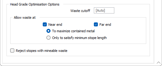 (These options are enabled when the Optimisation Value parameter is set to Use head grade on the Stope Optimiser > Mine > Definition > Model > Block Model page of the Mine Setup form.)