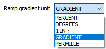 The ramp gradient unit is the unit of measurement for the gradients of elements such as roads, ramps, switchbacks in your design. Use the drop down list to select the default Ramp Gradient unit: