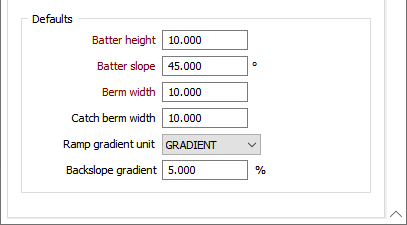 Using the options in the Defaultssection of the Pit Design Setup form, you can define the default settings to be applied when you use the string editing tools to generate the batters and berms for sectors at various levels within the pit outline.