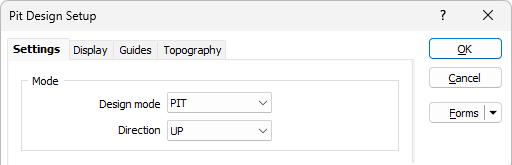 Select an expansion direction. Typically, you will select PIT as the design mode and choose an UP direction to generate a pit up and out from a digitised base string. Note that you can also set the direction from the Pit Design toolbar.