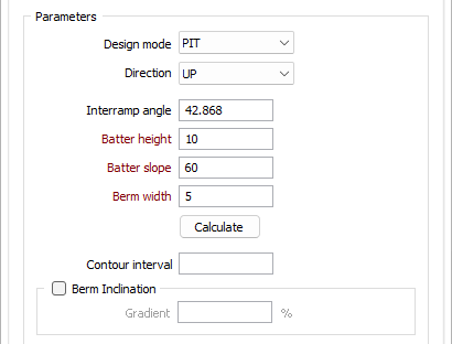 The Calculate button allows you to calculate any one of the following 4 values by leaving one value blank and varying the other 3. The Interramp angle, for example, can be calculated from the Batter height, the Batter slope, and the Berm width. Alternatively, enter a Batter height, a Batter slope, and a required Interramp angle, then click Calculate to calculate an appropriate Berm width.