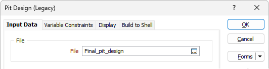 Double-click (F3) to select and load an existing Pit Design file. A *.PIT file is a string file which has an additional ROAD field. To create a new pit design file, right-click in the file input box and select New from the right-click menu.