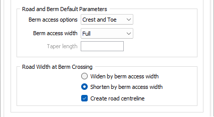 Specify how the berms will be accessed from the roads. In situations where you do not need to access every berm, you can choose to restrict access to the CREST or the TOE, or select the NONE option to disable berm access completely.