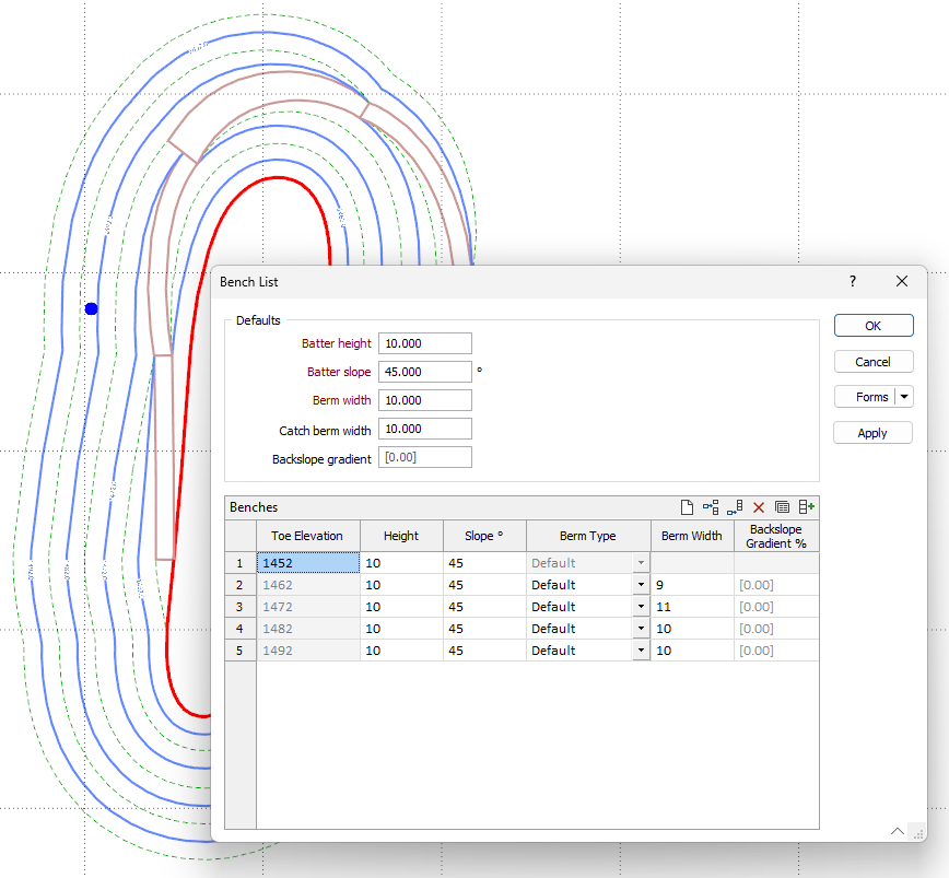 You can add ramps and drag them into position to recalculate the entire pit. If you change the default berm width, the whole pit will be automatically reset accordingly.
