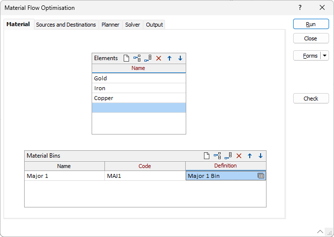 Click Optimise Material Flow to define a network of sources and destinations that generates or transforms material, applies constraints to locations, and routes material as required to optimise quantities into or out of destinations.