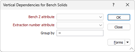 Select Vertical | For Bench Solids to build vertical dependencies between bench solids for one or more pits using extraction number, bench Z and optional pit identifier.