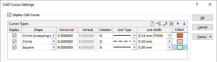 Enhancements have been added to the CAD Cursor Settings form. Multiple Cursor Types can now be configured in a grid, with a separate Rotation value and other settings.