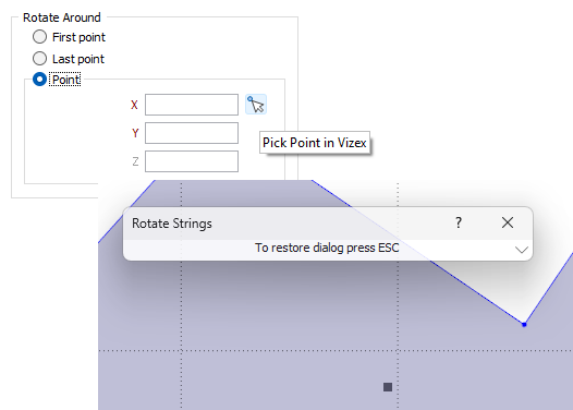 The Pick Point in Vizex button has been added to various Design | Editing tools to allow the selection of coordinates in Vizex.