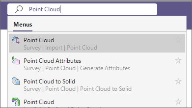 The search is updated as you type into the Search box. A list of results shows the menu path of each command that matches the search string: