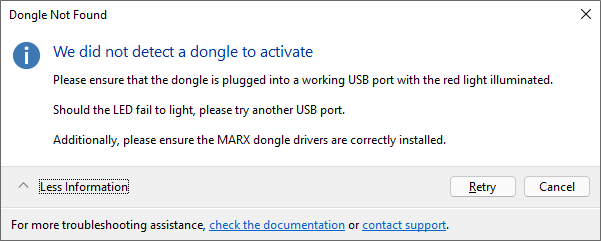 Additionally, please ensure the MARX dongle drivers are correctly installed. Note: You may need to install the latest drivers – Click here to download.