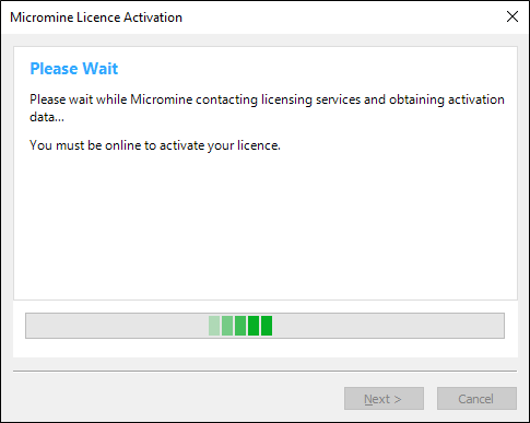 - Please wait while the application contacts Licensing Services to obtain activation data.
