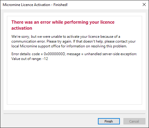 - If an error occurs please take a screenshot, or write down the error code and the message, before contacting licensing support. Press Next to complete the activation process.