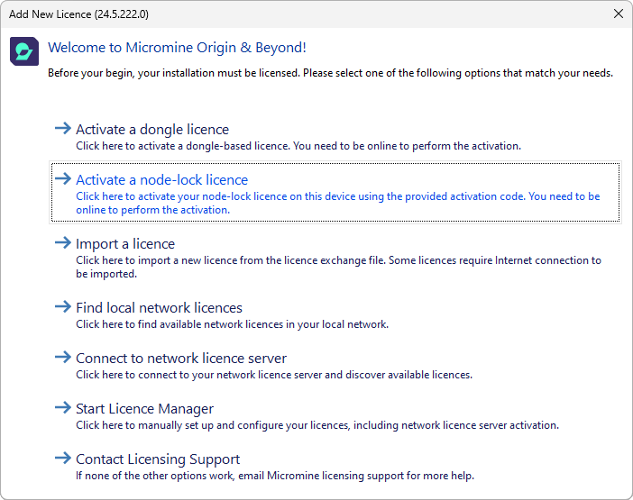 If you are installing 2024.5 for the first time, you will need to activate your licence, using either the activation code for a local node-locked licence, or the USB security key (dongle), supplied to you by Micromine Australia Pty Ltd Licensing.