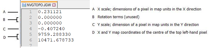 A World File contains the information needed to georeference an image. The illustration shows the contents of a typical World File. World Files are usually created at the same time as the image they accompany.