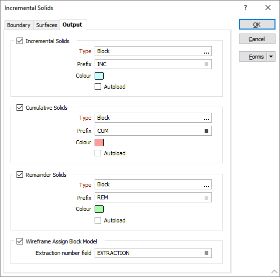 On the Output tab of the Incremental Solids form, choose whether Incremental, Cumulative and Remainder Solids wil be generated as a result of the process.