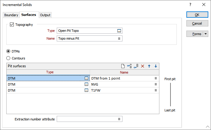 On the Surfaces tab of the Incremental Solids form, specify whether topography or DTMs/Contours will be used to cut the block model.