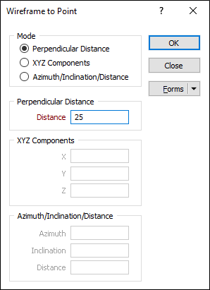 If you select Azimuth , Inclination and Distance, you can close the wireframe to a point at a specified distance and in a direction specified by entering Azimuth and Inclination values.
