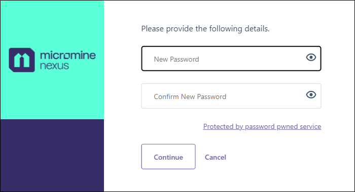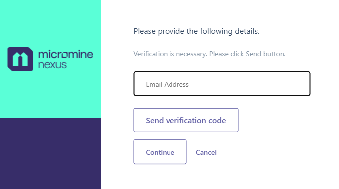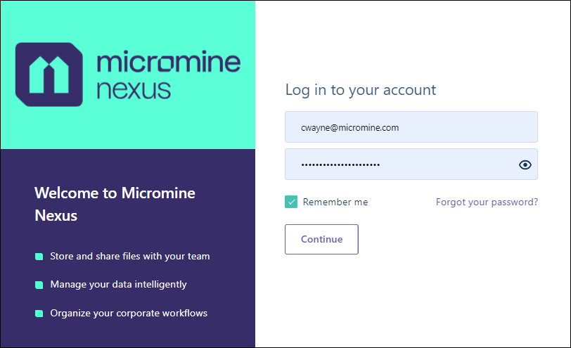 If you have a Nexus account, enter the email address and password provided to you by Micromine and click Continue.