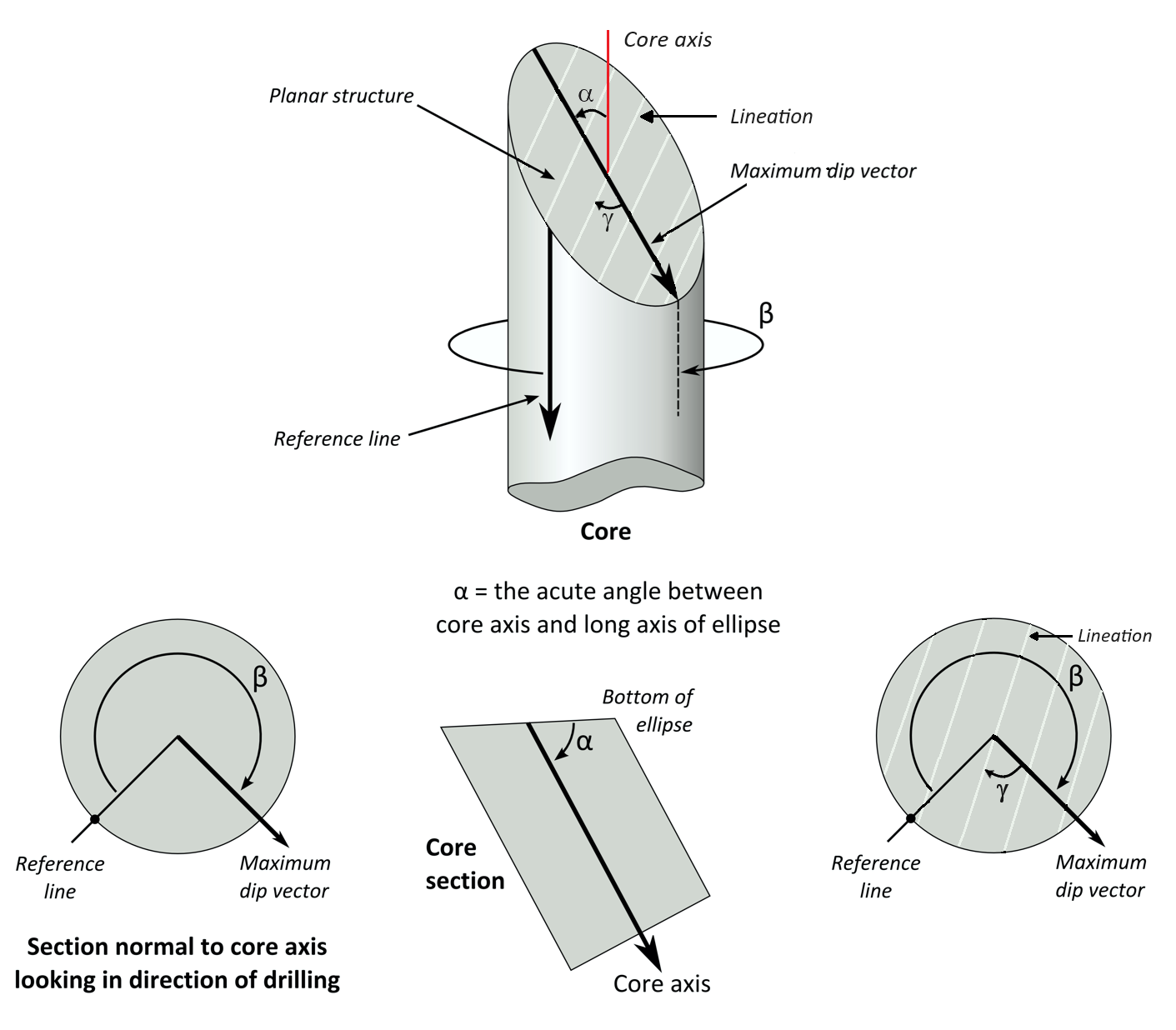 The b angle in oriented core is measured clockwise from the reference line to the bottom of the ellipse representing the intersection of a planar feature with the core.