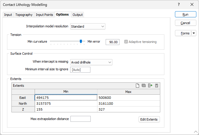 On the Options tab of the Contact Lithology Modelling form, set the parameters and define the surface area (extents) for the interpolation.