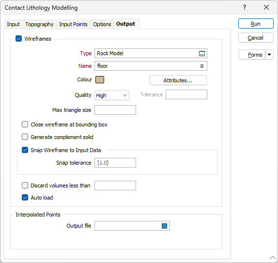 The generated wireframes may be slightly offset from the points they were created from. Select this check box to snap the wireframes to the input data. Snapping will move the closest triangle to each snap point, if the distance between the two is less than the specified Snap tolerance.