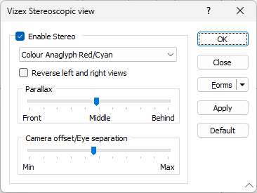 When the Enable Stereo check box option is selected, a number of settings are available in the Vizex Stereoscopic View form: