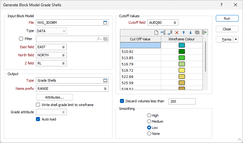 The Grade Shells form requires an input block model file and a colour set based on one of the fields in that file as input. The colour set defines cutoff values for each of the shells.