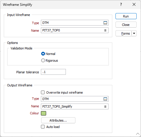 Select the type of the wireframe and then enter (or double-click to select) the name of the wireframe that will be used as input to the Simplify process. Wireframe types are defined in a triangulation database (*.tridb) file, and may be located in the current project or in any folder location.