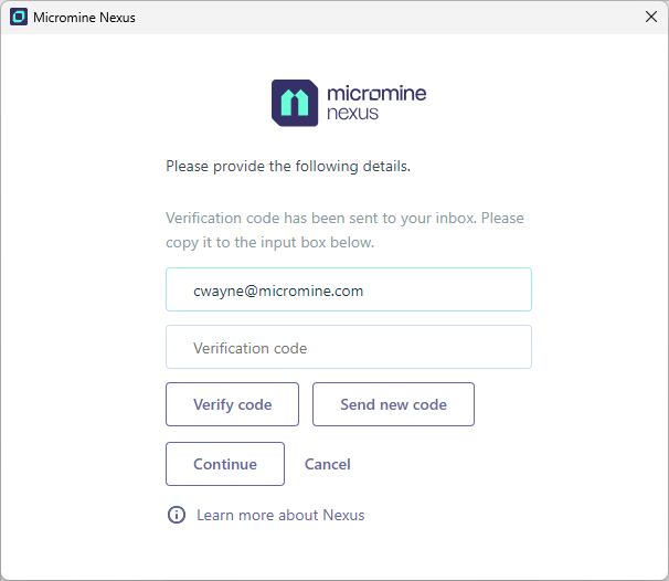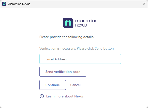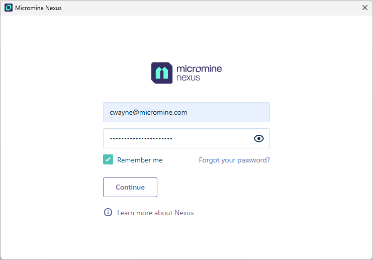 If you have a Nexus account, enter the email address and password provided to you by Micromine Australia Pty Ltd and click Continue.
