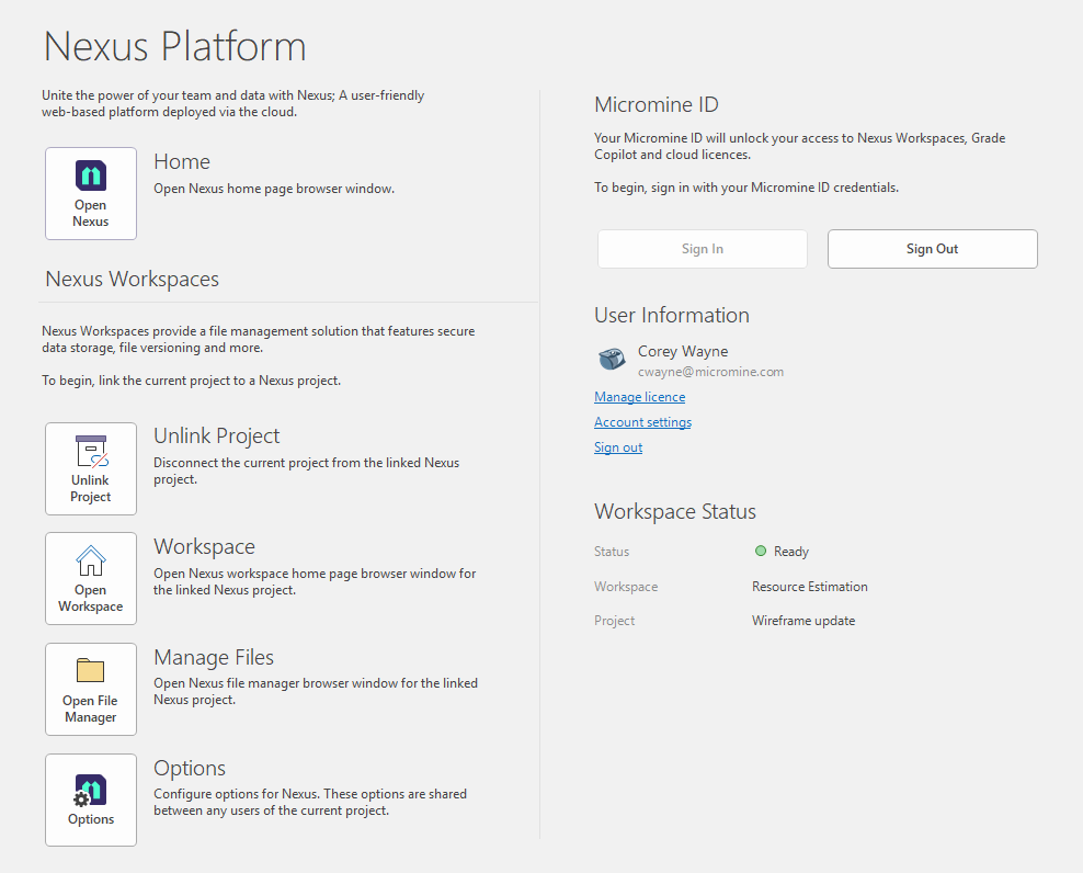In order to work with Nexus, at the start of a Micromine Origin & Beyond session, you will need to connect to the Nexus server and sign in. Information on any connected Nexus Workspace/Project as well as the Sign In link to the server is contained in the Backstage Menu.