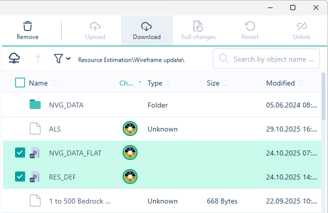 The Sync Tool displays a list of the updated files in Nexus or the local MMO&B project. The Sync Tool can be opened from Micromine Origin & Beyond.