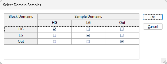 The diagonal (which is each singular block domain and sample) is selected by default. You can select multiple samples for each block domain. You can also deselect the block domain sample itself if required; if there are mismatches between domain codes in the block model and the sample file, for example.