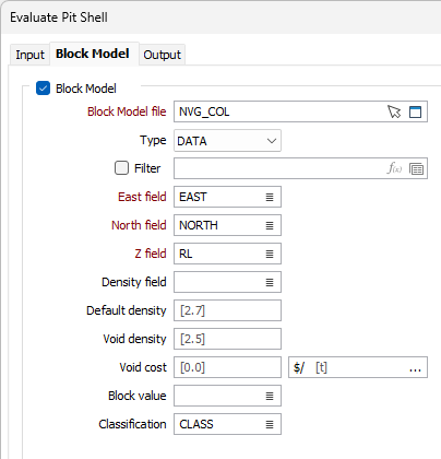 The Block Model tab of the Evaluate Pit Shell form is used to optionally select and define a Block Model for the evaluation. Any Block Model defined will be used as a source of reserve data to quantify the shells. The block model parameters will be used to facilitate the grade and tonnage calculation.