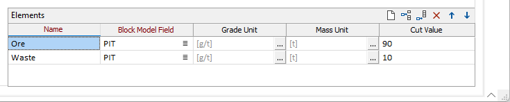 In the Elements grid of the Block Model tab, set up the profiles of the elements of interest for which attributes are to be calculated.