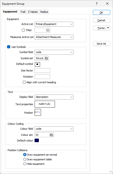 The Properties form for the selected layer group is displayed. For example, the Equipment Group properties form.