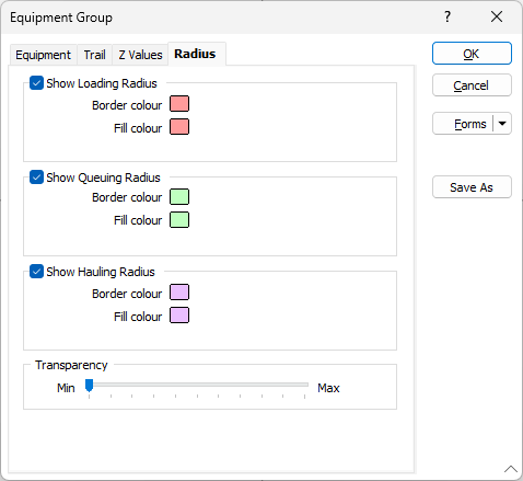 Use the Radius tab to display a radius of influence for the hauling cycle states—Loading, Queuing (at Dump), and Hauling.