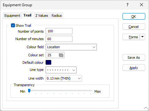 The Equipment Group form includes a Trail tab. This tab can be used to keep track of vehicle movements by displaying a location trail.