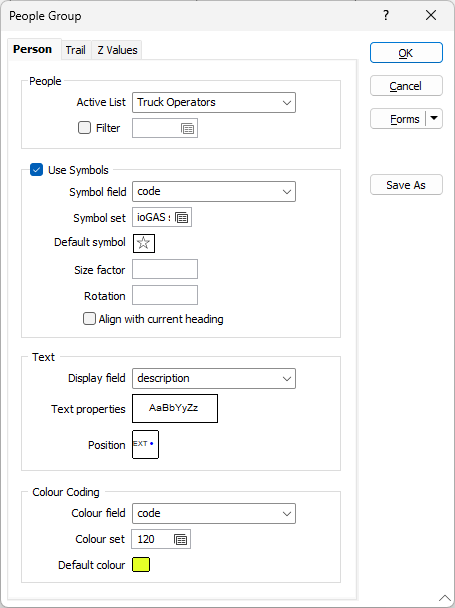 - Person. Defines the display of people for a location, including the active list, symbols and colour coding.