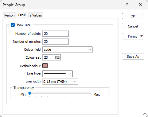 Optionally, double click (F3) to select the set that will be used to control the colour of the location trail. The colour set maps colours to text strings or numeric ranges. This determines the colour for each value in the colour field. Right click (F4) to create or edit a colour set.