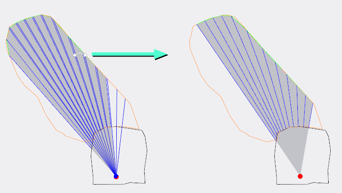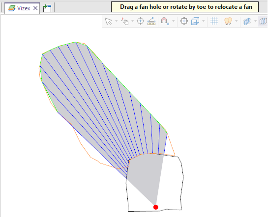 Note that when you edit a fan, using Edit Multiple Drillholes for example, and you move the position of one of the holes, the fan entity (depicted as a grey zone) disappears, since the entity created by the Generate Fan or the Generate Multiple Fans tool has been altered.