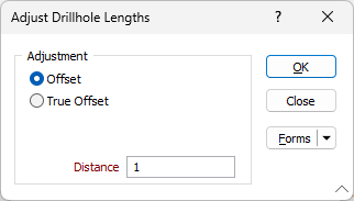 The Adjust Drillhole Lengths tool allows adjustment using either a standard method or a True Offset method. The standard method applies the specified distance by simply extending or retracting along the hole length. The true offset method creates a temporary line by offsetting the ring boundary perpendicular to the drillholes, using the specified distance. The holes are then extended or trimmed to the temporary line segment.