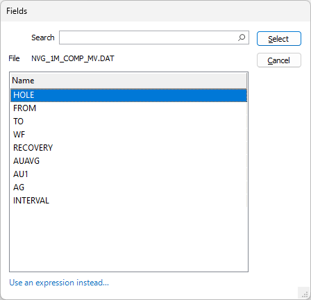 При выборе Файла интервалов вы можете выбрать поле для отображения. Если щелкнуть значок списка, откроется диалоговое окно «Поля» со списком доступных полей:
