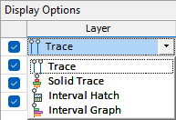 Для слоев Солиды по траекториям и График интервалов можно выбрать, применять ли масштабирование по логарифмической шкале. Для слоев Траектория и Штриховка интервала логарифмическая шкала используется обязательно и не может быть отключена. Trace layers do not require the configuration of any other details.