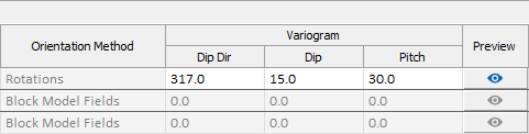 Для каждого настроенного метода ориентации домена и вращения вы можете ввести информацию о направлении падения вариограммы, падении и склонении в соответствующие поля. Вы можете отсортировать сетку ориентаций вариограммы по выходному полю, используя заголовок столбца для переключения направления сортировки.