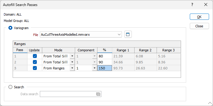 Примечание: Этот метод заполнит все домены и группы моделей настройками итерации поиска. Чтобы автозаполнить каждую итерацию поиска по отдельности, используйте кнопку Автозаполнение в каждой строке сетки "Ориентация эллипса".
