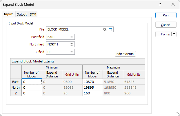 Подробную информацию о входной блочной модели, минимальное и максимальное количество блоков в каждом направлении, выходные данные и ограничения ЦМП можно настроить с помощью нового инструмента для предоставления расширенной блочной модели. Минимальные и максимальные значения расстояния расширения и единиц сетки в каждом направлении вычисляются автоматически на основе указанных параметров.