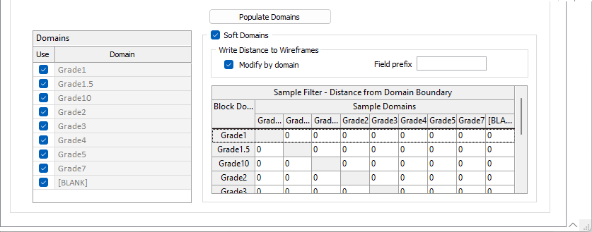 If the Modify by domain check box is not selected, distances can be defined for each block domain, rather than for each block and sample domain combination. Distances will then apply the same for each sample domain.