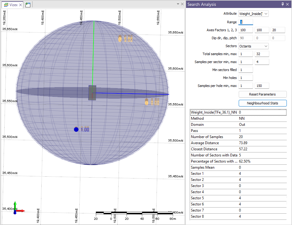 If you select a sample, the Search Analysis information panel will display values for the accumulated weight and other information for the sample. If a block is selected, more information will be available on the sample including the estimation of the block (soft domain weight, estimation weight, sector, distances etc.).