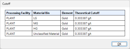 The Theoretical Cutoff value displayed in the dialog reports the incremental cutoff grade for each processing facility and material bin. (It is a variation of the marginal processing cutoff). The value is calculated from the cost and price information for the Underground Optimisation. The value is used to consider, given that material is being moved, whether it is worth processing as ore.