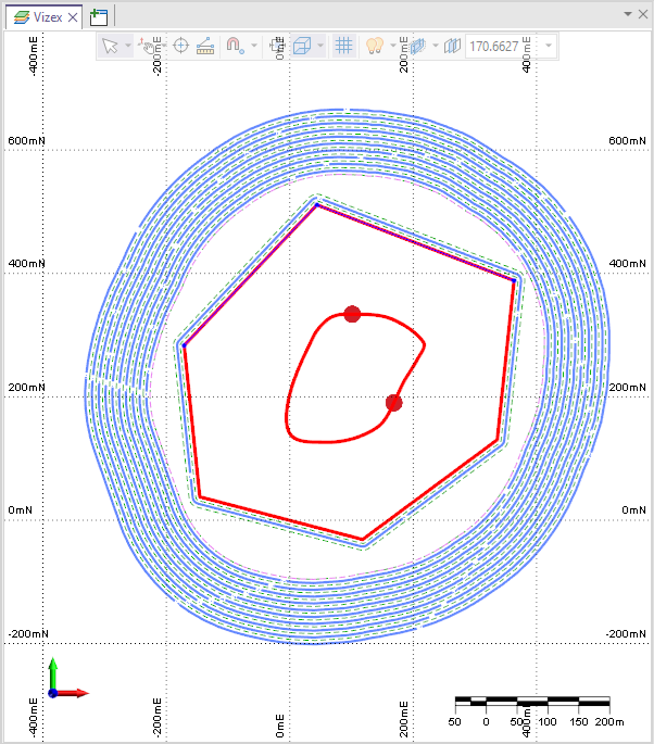Если выбран существующий стринг, который был наложен на топографию, зона исключения проецируется наружу (в отличие от внутренней проекции для границ карьера) при проецировании на каждый уровень уступа и создании неявного ограничения на этом уровне; затем ограничение применяется при построении карьера путём вырезания любой области внутри зоны ограничения.